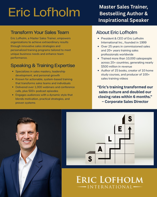 Join our special guest, internationally recognized Master Sales Trainer Eric Lofholm, for a powerful virtual workshop designed to help entrepreneurs, business owners, and sales professionals rapidly improve their sales performance.